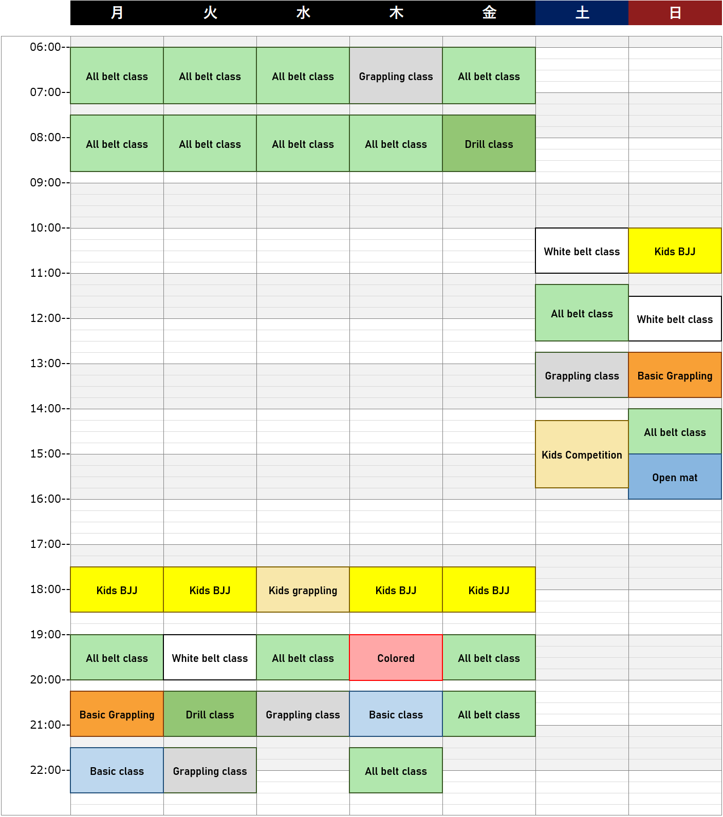 | kids BJJ |   平日(月・火・木・金)17:30〜18:30 日曜:10:00〜11:00 柔術の基本を学ぶクラスです。  |